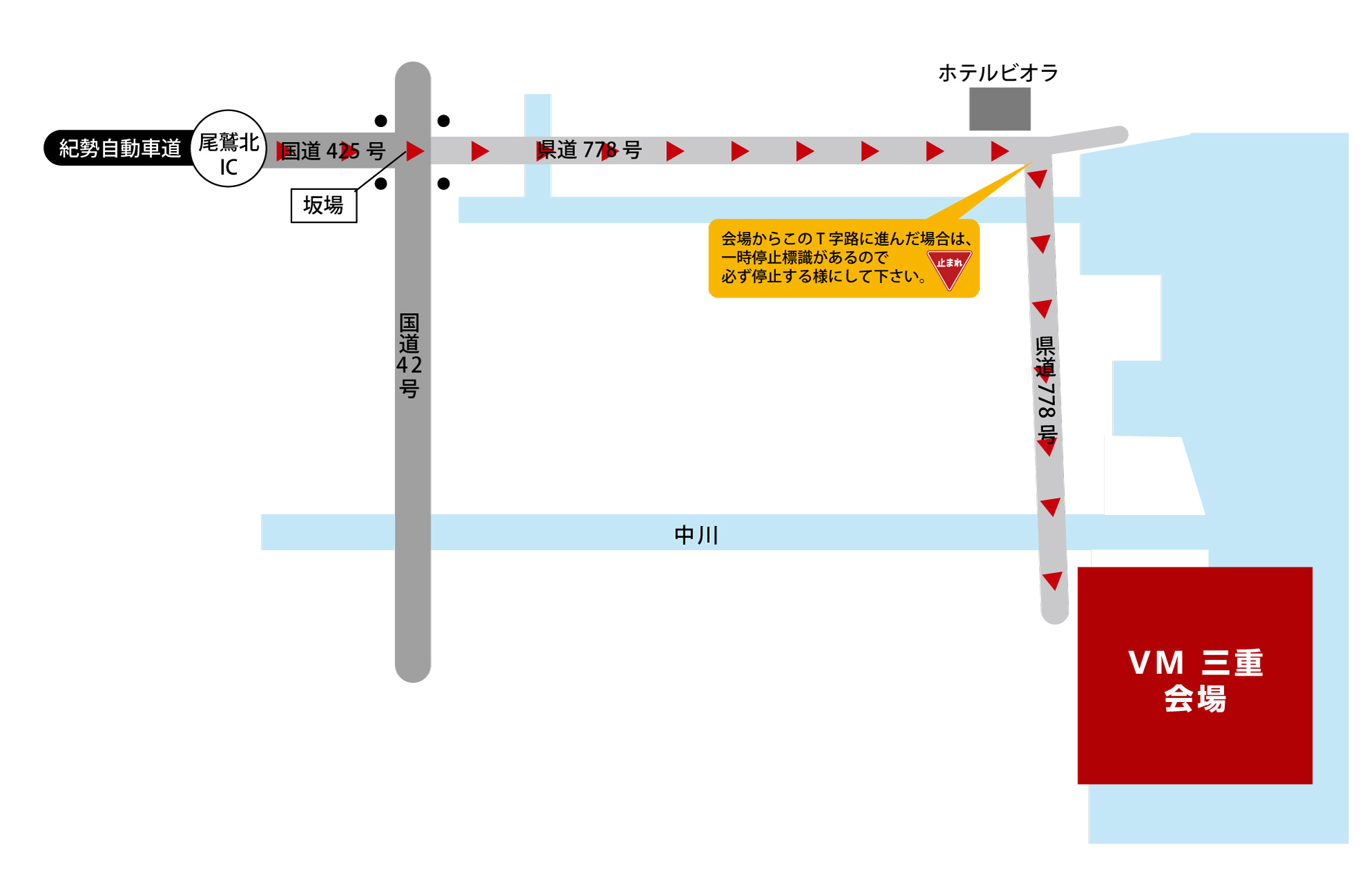 ●会場までのルートで尾鷲北インターは混雑が予想されますので、なるべくひとつ手前の海山インターで下りて国道42号線を利用してください。